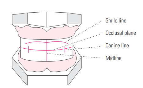 It follows the upper edge of the lower wax bite rim, i.e.: between the lower incisal edges in the anterior area and the distobuccal cusps of the lower second molar. It intersects the midline which is the fixpoint for the incisal pin and runs parallel with Camper`s plane.